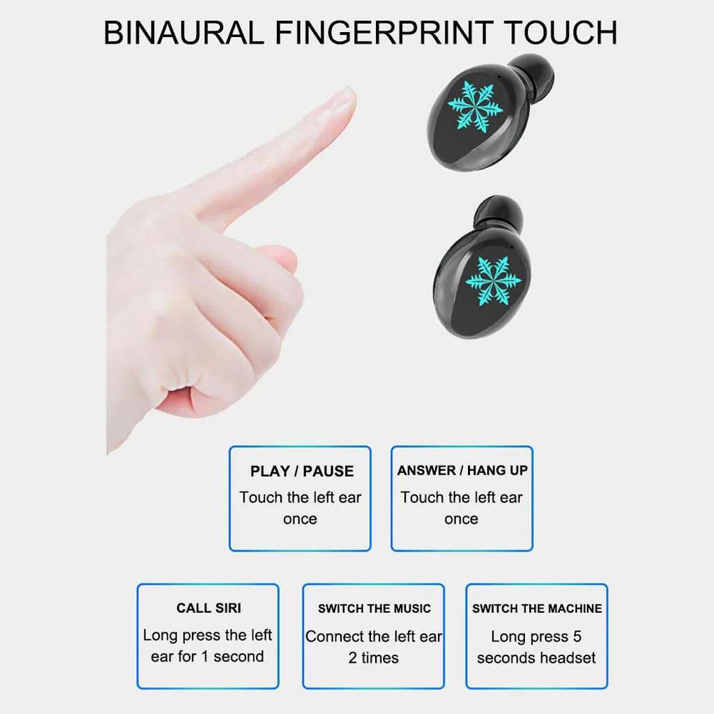 Functions: touch operation, binaural HD call, play pause, answer hang up, summon Siri, switch to the previous song, switch machine, automatic boot, automatic pairing, intelligent noise reduction, no delay in the game.
