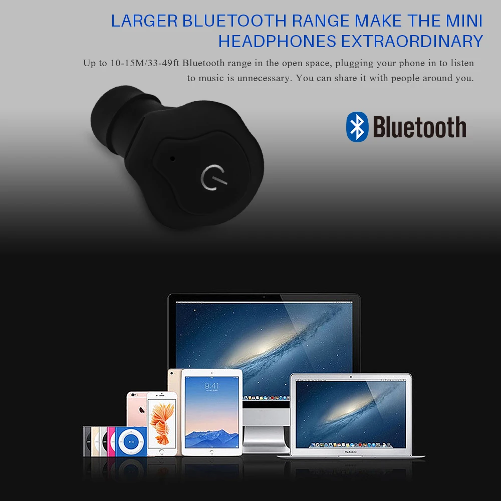 Larger Bluetooth range make the mini headphones extraordinary, Up to 10-15M/33-49ft Bluetooth range in the open space, plugging your phone in to listen to music is unnecessary. You can share it with people around you.